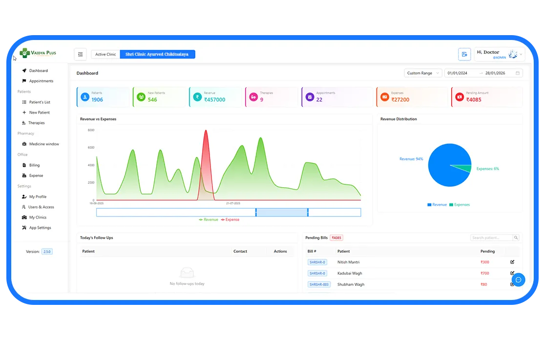 Whether you run a single clinic or multiple centers, VaidyaPlus plans grow with you and help manage your clinic efficiently.