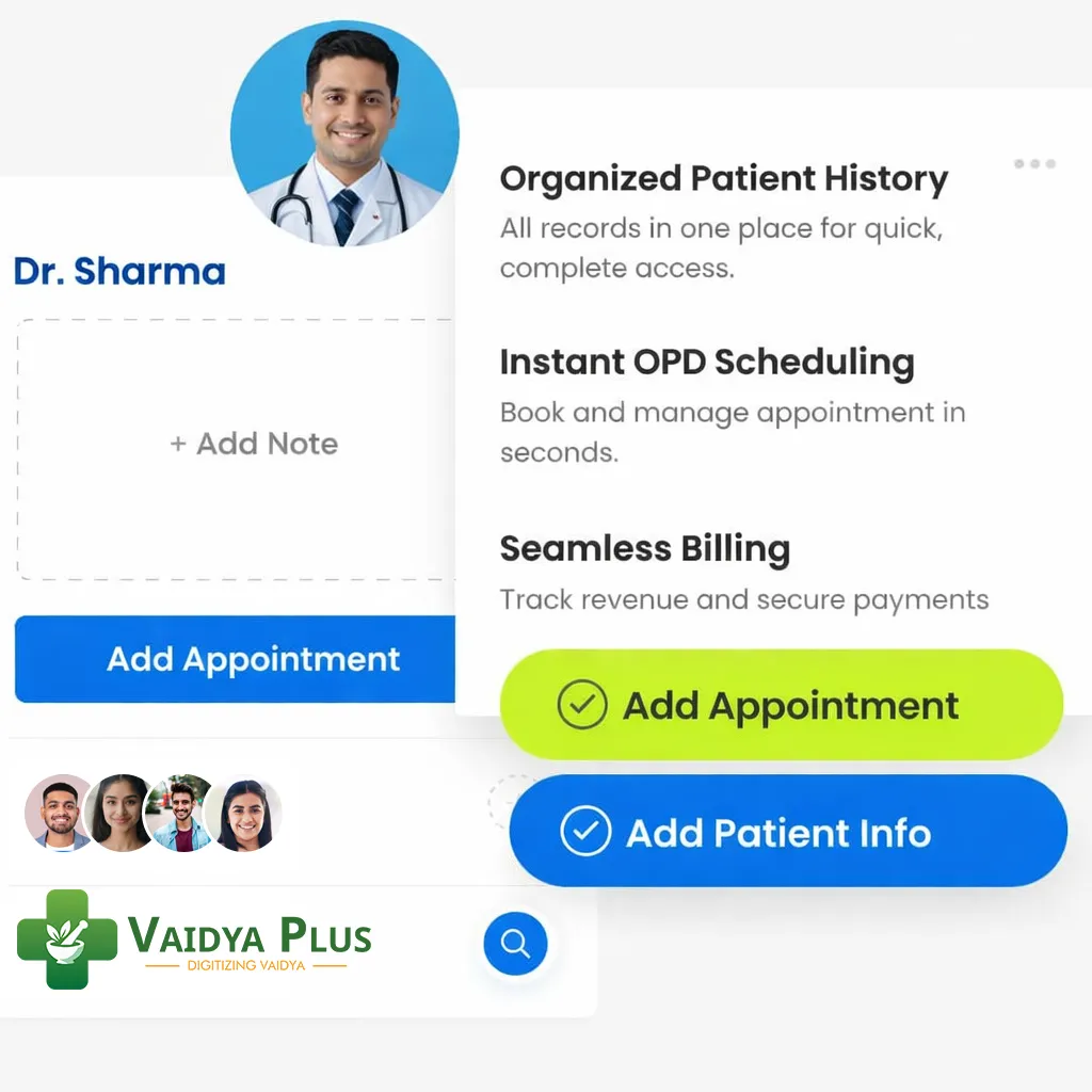 VaidyaPlus replaces pen-and-paper systems with a simple, digital solution. From appointment booking to patient records, billing, and follow-ups & everything is organized, secure, and accessible in one place.